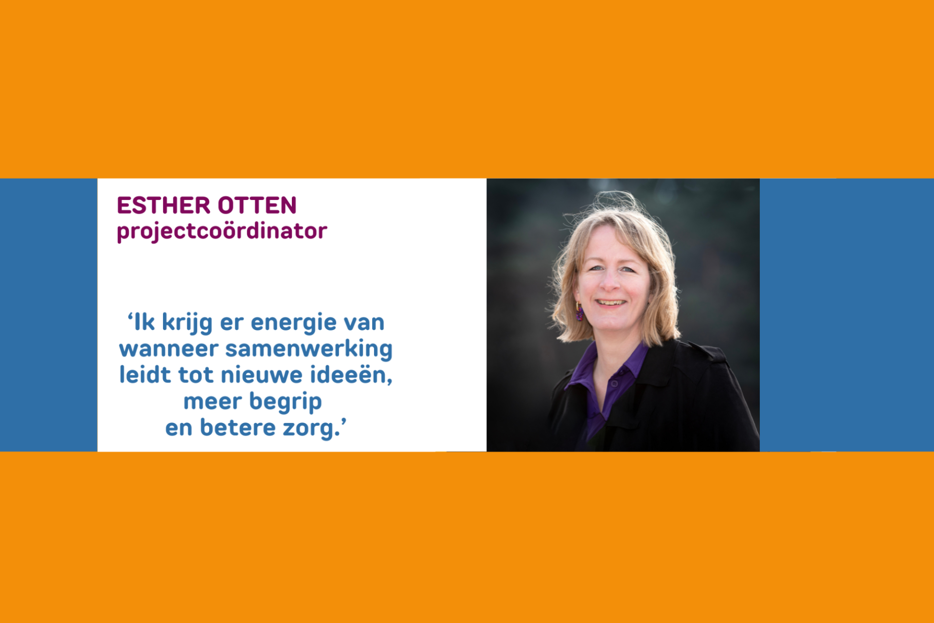 Wat Esther drijft, is het verbinden van mensen en organisaties om samen het verschil te maken. “Ik ben nieuwsgierig en betrokken, en krijg energie wanneer samenwerking leidt tot nieuwe ideeën, meer begrip en betere zorg,” vertelt zij.